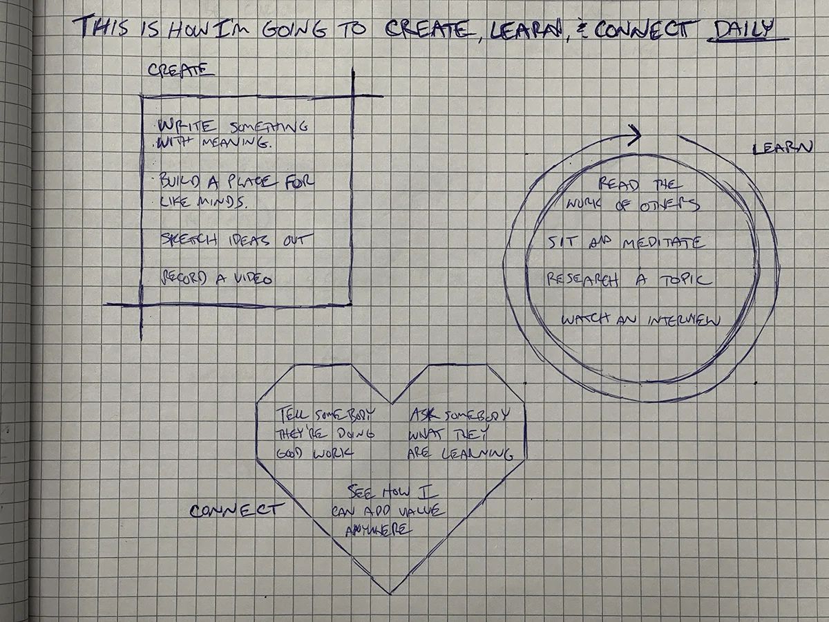 Without being overly calculated, I was able to quickly get to the buckets I want to fill my day by. I need to be consistently creating, learning, and connecting. I had decided that much before I got home. If I'm not doing each of those daily, a sense of incompleteness and dread will reside in the shadows. And nothing else will really change.